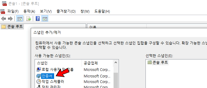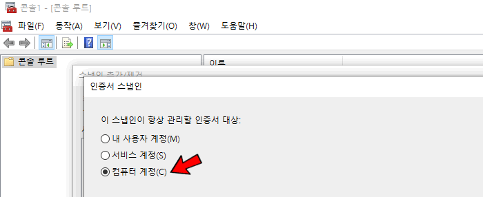 콘솔UI ) 파일 ➜ 스냅인 추가/제거 ➜ 인증서 (선택/추가) ➜ 컴퓨터 계정 (다른것 선택 X) ➜ 인증서 스토어 관리 콘솔