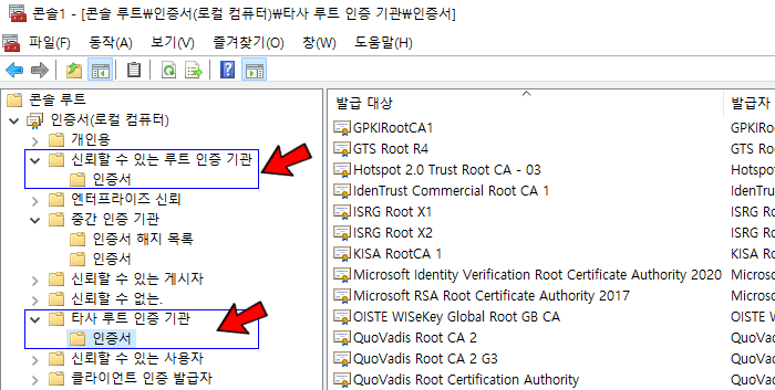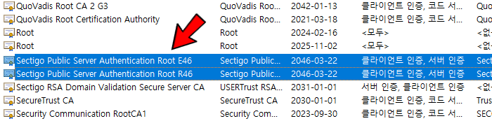 '신뢰할 수 있는 루트 인증기관' 및 '타사 루트 인증 기관' 에서 최신 루트가 있는 경우 아래와 같은 조치(기능 비활성화)를 각각 설정합니다.