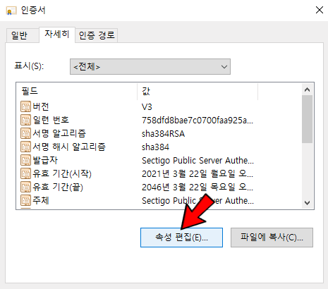 대상 루트 인증서를 더블클릭(또는 속성보기)하여, 속성창을 아래와 같이 실행후, [속성편집]을 클릭합니다.