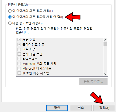 속성 창의, [일반] 탭에서 아래와 같은 [인증서 용도] 에서, '이 인증서의 모든 용도를 사용 안함' 설정을 적용합니다.