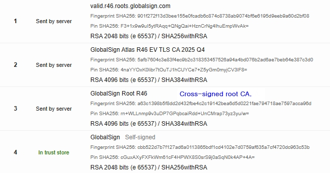 | GlobalSign Root R3 (SHA256, RSA, 다목적) | 다목적 → 비권장 (전환) | - 2025년 Q3 (7~9월): 선택적 R46 전환 시작 - 2026년 Q3 (6~9월): 모든 TLS 발급 중단, R3→R46 크로스 사인으로 체인 전환 - 2026년 9월 13일: SCTNotAfter 제약 적용 (Chrome 신뢰 상실 시작, 90일 후 완전 제한) |
