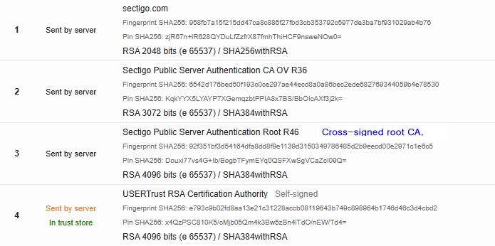 | Sectigo Public Server Authentication Root R46 (RSA, TLS 전용) | 신규 TLS 전용 | - 2024년 말: 주요 root store(Mozilla, Apple, Google) 포함 - 2025년 4월 15일: EV TLS 발급 시작 - 2025년 6월 2일: DV TLS 전체 전환 - 2026년 1월: 모든 TLS 발급 완료, Chrome 준수 |